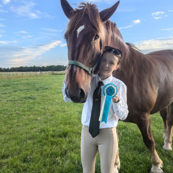 Evelyn grew up on her family’s farm where she was immersed in animal care from a young age. Her family breed Suffolk Punch horses, a rare heavy horse breed. She grew up helping with daily care and training, and has been part of demonstrations of both driven and ridden work with these magnificent horses.